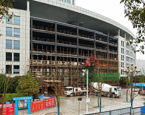 走進市民服務中心D棟施工現(xiàn)場,只見泵車正在澆筑六樓混凝土,3臺攪拌車有序作業(yè)、升降機上下忙碌,工人們戴著口罩卯足干勁,工地上呈現(xiàn)一派熱火朝天的景象。“為了趕進度,我們從其他項目臨時借調(diào)人員過來?!?ensp;項目負責人向躍蘭告訴記者,現(xiàn)在工地上有40多名工人,他們在抓緊施工的同時,關(guān)閉員工食堂,向政府食堂報餐,實行“盒飯打包、分散就餐”,確保施工、防疫“兩不誤”。