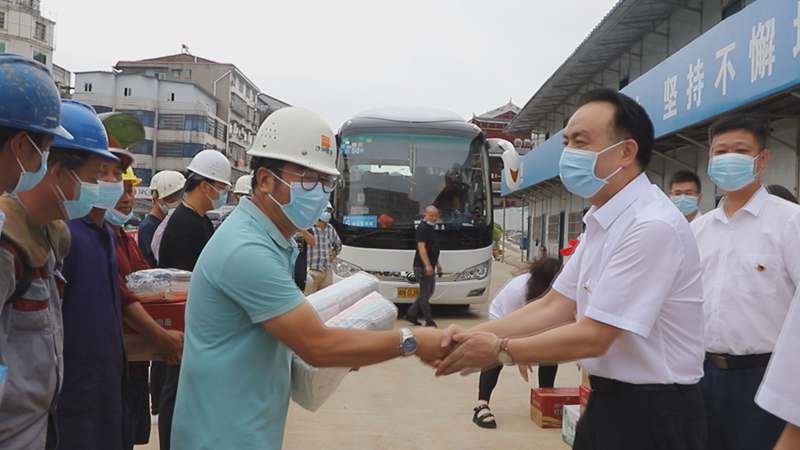 領(lǐng)導(dǎo)班子成員將慰問品和防疫物資遞交給施工人員