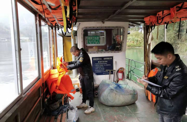 圖5 洪江市水運(yùn)事務(wù)中心工作人員在官溪口渡口著重檢查船舶證書(shū)、船員證照、船上消防救生及防污染設(shè)備,并督促渡工嚴(yán)格遵守“六不發(fā)航”制度。