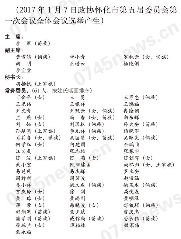 政協(xié)懷化市第五屆委員會(huì)主席、副主席、秘書長、常務(wù)委員名單