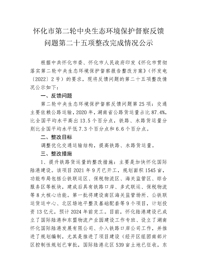 懷化市第二輪中央生態(tài)環(huán)境保護(hù)督察反饋問題第二十五項(xiàng)整改完成情況公示