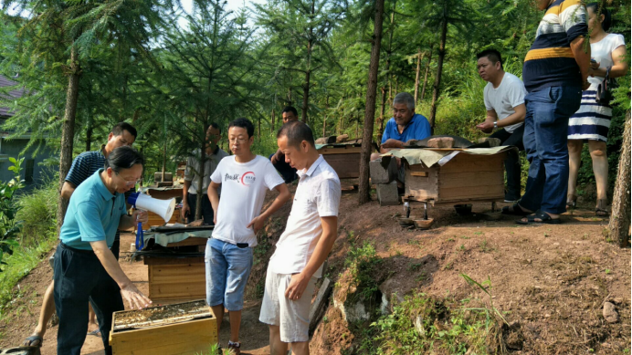 2019年9月3日,華中農(nóng)大張新軍教授在涼亭坳鄉(xiāng)尹家?guī)X村現(xiàn)場指導(dǎo)和培訓(xùn)養(yǎng)蜂知識。