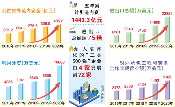 五年累計(jì)引進(jìn)內(nèi)資1443.3億元,進(jìn)出口總額翻了5倍,入駐懷化的“三類500強(qiáng)”企業(yè)由4家發(fā)展到72家——