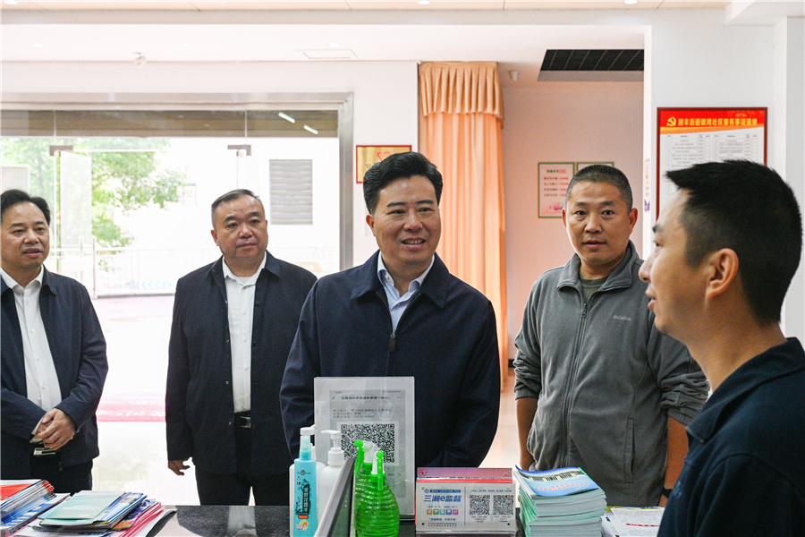 (10月9日上午,市委副書記、市長黎春秋以“四不兩直”方式在鶴城區(qū)督導檢查“一迎三創(chuàng)”工作。圖為黎春秋在迎豐街道銀灣社區(qū)檢查。懷化日報全媒體記者 潘雨 攝)