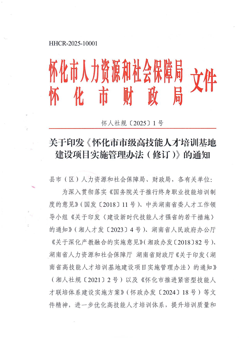 關(guān)于印發(fā)《懷化市市級(jí)高技能人才培訓(xùn)基地建設(shè)項(xiàng)目實(shí)施管理辦法(修訂)》的通知