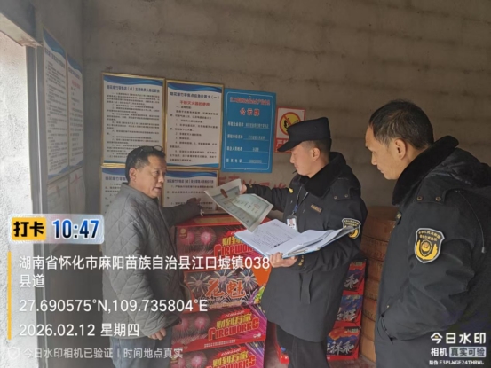 2月12日,麻陽江口墟鎮(zhèn)綜合執(zhí)法大隊(duì)一行到轄區(qū)商鋪、煙花爆竹零售店開展歲末年初煙花爆竹安全生產(chǎn)檢查。